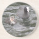 This pretty sandstone coaster features a photograph of a Coot and her chick swimming on a tidal river. The female is grey with a white patch on her head and red eyes, while the tiny fluffy chick is pale grey with a white front.