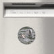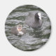 This magnet features a photograph of a Coot and her chick swimming on a tidal river. The female is grey with a white patch on her head and red eyes, while the tiny fluffy chick is pale grey with a white front.