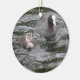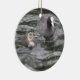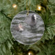 This pretty pendant style ornament features a photograph of a Coot and her chick swimming on a tidal river. The female is grey with a white patch on her head and red eyes, while the tiny fluffy chick is pale grey with a white front.