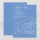 Central Park wedding invitation. Destination wedding New York City, Central Park Cop Cot gazebo wedding ceremony invitation. Blue with white silhouette illustration of this popular Central Park wedding location.