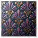 Seamless pattern of purple and copper Art Deco fan shapes on a dark blue background, symmetrical arrangement, elegant and luxurious design, vintage style.