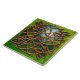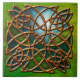 Versatile Ceramic Tile features a beautiful, intriguing original digital painting by Leslie Sigal Javorek of an intricate Celtic knot that creates the illusion of 3-D leaded stained glass w/ an aged copper patina fused to a mottled green glazed background.