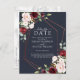 Pretty and trendy, this bridal shower postcard invitation design features a faux copper rose gold geometric embellished with burgundy, blush and white floral and eucalyptus greenery floral arrangements. Contact designer for matching products, with a navy blue background. Copyright Elegant Invites. All rights reserved.