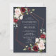Modern and trendy, this gorgeous wedding invitation design features a faux copper rose gold geometric embellished with beautiful burgundy and pink watercolor roses, buds, and eucalyptus greenery, on a modern navy blue background. The back of the card features your favourite engagement photo. Copyright Elegant Invites, all rights reserved.