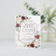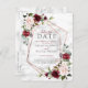 Pretty and trendy, this bridal shower postcard invitation design features a faux copper geometric embellished with watercolor eucalyptus greenery and burgundy and pink floral arrangements, over a faux white marble bark texture. Copyright Elegant Invites. All rights reserved.