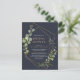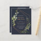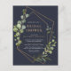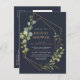 Modern and trendy, this bridal shower postcard invitation design features a faux copper geometric embellished with watercolor eucalyptus greenery, over a navy blue background. Perfect for modern brides! Copyright Elegant Invites. All rights reserved.