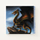 A majestic dragon with copper, gold and black scales on a cliff edge with blue skies in behind.