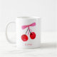 Cute cherry and bow coffee mug. Personalise with your own name, initials or choice of text. Original art from artists own illustrations. Matching items available. Please use the message me button below for help with further customisation and special requests. © Zoe Chapman Design