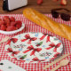 Coquette Christmas Plates that feature red bows, mistletoe, and Christmas trees.