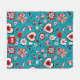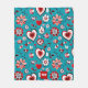 This blanket design features a charming and vibrant pattern with a teal background adorned with an array of floral motifs and heart accents in red, white, and pink. The bold flowers and whimsical hearts create a playful, romantic aesthetic. A monogram section in the bottom corner is customisable with your chosen initials, adding a personal touch to this cosy and stylish piece. Perfect as a gift or a statement decor item!