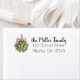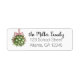 These Christmas address labels feature a watercolor portrait of a ball of mistletoe hanging up by a red and white stripped ribbon bow.
