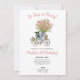 This invitation features a watercolor portrait of a cute little puppy sitting on a bike with a large bouquet of pink flowers and blue and white bows.