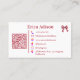 This business card is an excellent choice for professionals in industries like beauty, fashion, wellness, and event planning. Whether you're a makeup artist, boutique owner, wedding planner, or yoga instructor, the pink bow exudes charm and professionalism tailored to your field. The QR code provides a seamless way to showcase your work or schedule appointments, making it especially valuable for freelancers and entrepreneurs looking to streamline client interactions while leaving a lasting impression. Bow is generated by hotpot.ai.