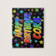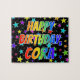 This lively and vibrant birthday-themed jigsaw puzzle design features the message "HAPPY BIRTHDAY, CORA" with the characters having a colourful rainbow spectrum inspired gradient pattern, along with a fun star field background pattern. A vibrant puzzle like this might be used to send a birthday greeting message to somebody named Cora. [~Z0000468]