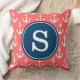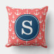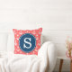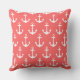 Stylish and chic square accent pillow design features a nautical pattern of white boat anchors with round cobalt blue monogram design. The bright coral pink / red background colour can be customised.