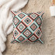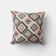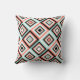 Modern throw pillow with a fun pattern made up of multiple sizes of diamond shapes in coral orange, mint green, black, and white.