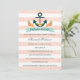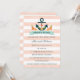Coral and navy blue nautical wedding, engagement, couples or bridal shower invitations with an anchor with a coral heart hanging off its rope and coral flowers and yellow roses with green leaves make up the floral elements of this lovely seaside themed design. The aqua hued ribbon look banner can be personalzied with the names of the happy couple. A pale peach and white watercolor look striped background complete this by the beach look invite. Artwork © Chrissy H. Studios, LLC. All rights reserved.