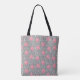 This tote bag has a mid-century modern design of grey arches repeating on white as a background with repeating coral circles with white starbursts inside them.
