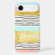 Customisable name i phone 6 case in modern colour block stripes pattern with dark grey wavy watercolor lines pattern, glamourous gold effect, peach coral pink watercolor effect, light aqua sky blue and white. Contact us for a custom colour.