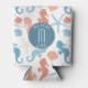 Tangerine coral and cerulean blue are the colours in this pretty nautical theme can cooler. Images of seahorses, seashells, and starfish make up the repeating pattern. At the centre front is a matching blue circle banner with your monogram in white. Above and below the monogram are custom text fields, which say "BEACH LIFE" in the example. Everything is placed on a white background.