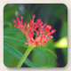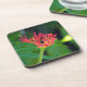 The coral bush is in the jatropha family. It's a very pretty, tropical plant. The original photograph by MaeFlowers on this Coaster is a closeup of a coral bush, sometimes called a coral palm. We see a beautiful deep pink bloom up close, with tiny yellow flowers starting to emerge. We see the bush's long, thin green leaves behind, and more natural greens in soft focus in the background of the photo.