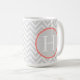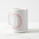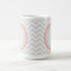Enjoy your coffee or tea with a personalised Coral Chevron Monogram Coffee Mug. Coffee mug design features a light grey chevron pattern with a circle emblem outlined in coral. Additional items available with this design as well. Please contact me directly for assistance with personalisation.
