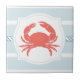 This ceramic tile has a nautical theme with soft blue chunky stripes in the background with a rope design in the middle. Centred is a white frame with a coral coloured crab silhouette. Some design elements are copyright Graphic Market