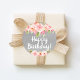 A rustic style sticker for a birthday party. With contemporary pink, peach and coral coloured watercolored dahlia flowers. A rustic grey painted wooden wall as background. White hand lettered style script and the text: Happy Birthday!
