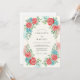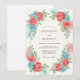 A delicate watercolor design features coral roses intertwined with soft blue blossoms and lush green leaves. The airy, painterly style evokes a romantic and whimsical atmosphere, perfect for a spring or summer occasion.