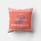 Stylish and modern trending style living coral colour family beach house monogram script decor throw pillow, blue monogram initial with white bold typography and stripes. Just use the "personalise this template" feature to insert your family name, initial and the established date.