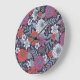 This wall clock features zinnias surrounded by other flowers and leaves in shades of coral, white, magenta, and blue on a navy blue background.