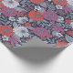 This gift wrap has zinnias surrounded by other flowers and leaves in shades of coral, white, magenta, and blue on a navy blue background.