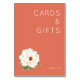 This is a minimalist style image featuring a soft coral background with the words "CARDS & GIFTS" elegantly written in white. Below, there's an exquisite illustration of a delicate white flower with green leaves and a subtle brown center, adding a touch of natural beauty to the design. The phrase "thank you" is gracefully placed at the bottom, enhancing the sentiment of gratitude. Perfect for expressing appreciation or celebrating special occasions, this design exudes warmth and sophistication.