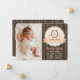 Add your three favourite pictures on the front and back of this sweet western baby photo birth announcement. Monogram the front of the card with your baby girl's initial inside the horseshoe design. Add your own wording to the gender neutral pale peach and coral banner with a floral laurel wreath beneath it with roses, sunflowers and cherry blossom and dogwood branch with berries. It currently says, Howdy, Y'all A wood fence and barrel background with nail head trim completes this cute country and rustic themed birth announcement. Perfect for the proud parents who love a cowgirl, farm, farmhouse, rodeo, barn house or vintage themed design. Artwork © Chrissy H. Studios, LLC. All rights reserved.