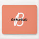 Trendy, stylish custom name and initial monogram style mouse pad in modern minimalist script typography in off black and white on a simple fun coral orange background. The name and initial can easily be personalised with your own name or the name of a loved one for a perfect gift for a friend or loved one!