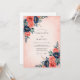 This romantic design features lush watercolor clusters of coral roses and navy blue anemones paired with delicate sage green foliage. A soft peach watercolor wash serves as a warm, artistic backdrop for the floral arrangements. The aesthetic combines deep indigo tones with vibrant salmon hues for a sophisticated and modern seasonal look.