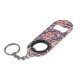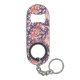 Keychain bottle opener with a pattern of overlapping corals in dark purple, orange red, and peach.