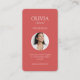 Modern and stylish business card featuring a QR code for social media, photo, tagline, enquiry details and social media links. Primary colours used in template are coral and white. This versatile all-in-one-template can easily be updated. Replace circle photo with own profile photo or company logo. Your image will be adjusted automatically to fit into a circle shape. The design has a fresh & chic look and feel.