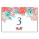 Coral Pink and Aqua Floral Wedding Table Number