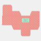 Coral pink and white polka dot pattern birthday party favour box. The design features a white polka dot pattern on white and a mint green shape in the middle with your custom text.