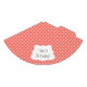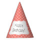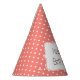 Coral pink and white polka dot pattern birthday party paper hats. The design features a white polka dot pattern on white and a white shape in the middle with your custom text.