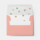 Personalise with your return address this coral pink wedding invitation envelope featuring a patterned interior with a scatter of pretty pastel dots in aqua, mint green, coral pink and tan with accents of faux copper foil. Change the background colour and the text colour by clicking the "Customise it" button.