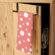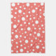 A stylish kitchen towel featuring a cheerful coral background with playful white polka dots, adding a fun and modern touch to your kitchen décor.