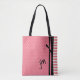 Chic designer looking carry all tote bag, done in coral with a tiny white polka dot pattern, with one side of the bag done in a coral and white striped pattern. Graphics of a black three ribbon band, runs down between the two backgrounds, on both sides of the bag. A two letter monogram, on the bottom right front, of the bag, is ready to personalise. What a great gift idea for her.
