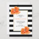 Lovely engagement party invitation displaying beautiful coral poppies and black-white stripes. A great choice for a spring or summer wedding.