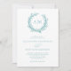 Perfect for beach and nautical themed weddings, a coral wreath frames the monogram initials of the bride and groom at the top of this elegant minimal white and sea glass blue coastal invitation. The back is a solid sea glass blue colour.