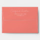 Coral colour mailing envelope for your wedding invitations and features your name and address printed on back flap in a modern script style. Personalise your envelope by editing and replacing name and address with your own. Edit further to change font style or colour. Select your envelope size that fits your invitation.