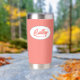Gift your wedding bridesmaid with this trendy and personalised, stainless steel, thermal tumbler with her name in stylised script in a white oval design. Background colour and script is a coral colour. Personalise your thermal tumbler by editing and replacing bridesmaid name with desired name. Available in many, popular bridesmaid wedding colour schemes.