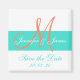 remind your guests of your upcoming wedding date with this beautiful modern save the date magnet in turquoise and coral and white colours. A simple, elegant design with monogram initial, bride and groom name and wedding date in elegant script font