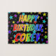 This vibrant, lively, birthday-themed jigsaw puzzle design features the message "HAPPY BIRTHDAY, COREY" with the characters having a colorful rainbow spectrum inspired gradient pattern, in addition to a fun field of stars background pattern. An exciting puzzle like this might be a fun way to send birthday wishes to somebody named Corey. [~Z0000468]